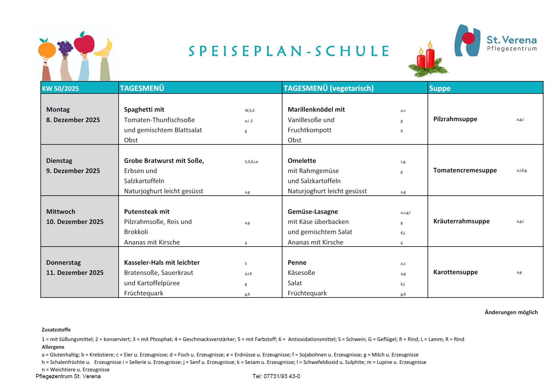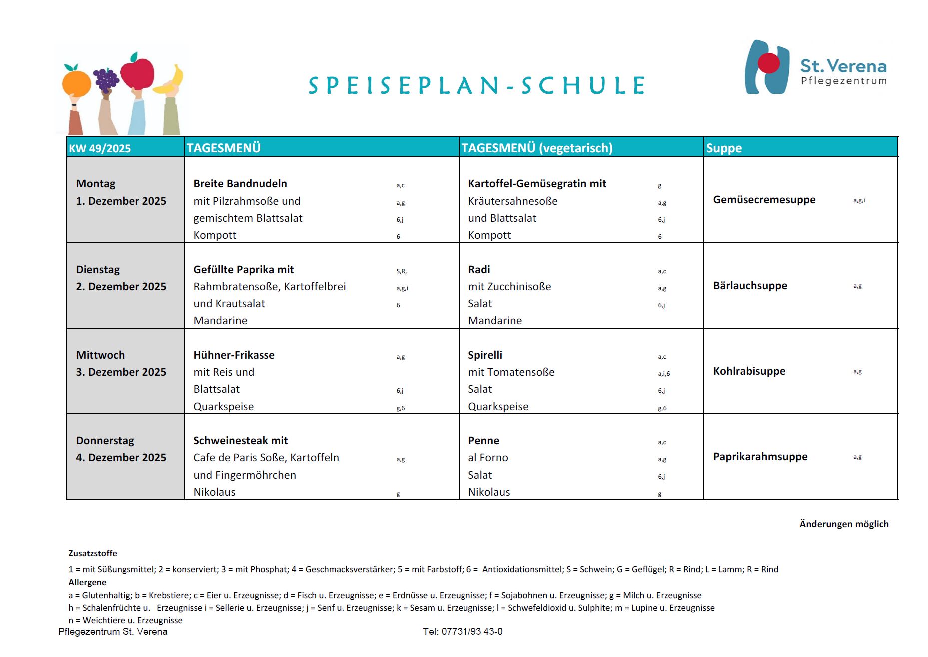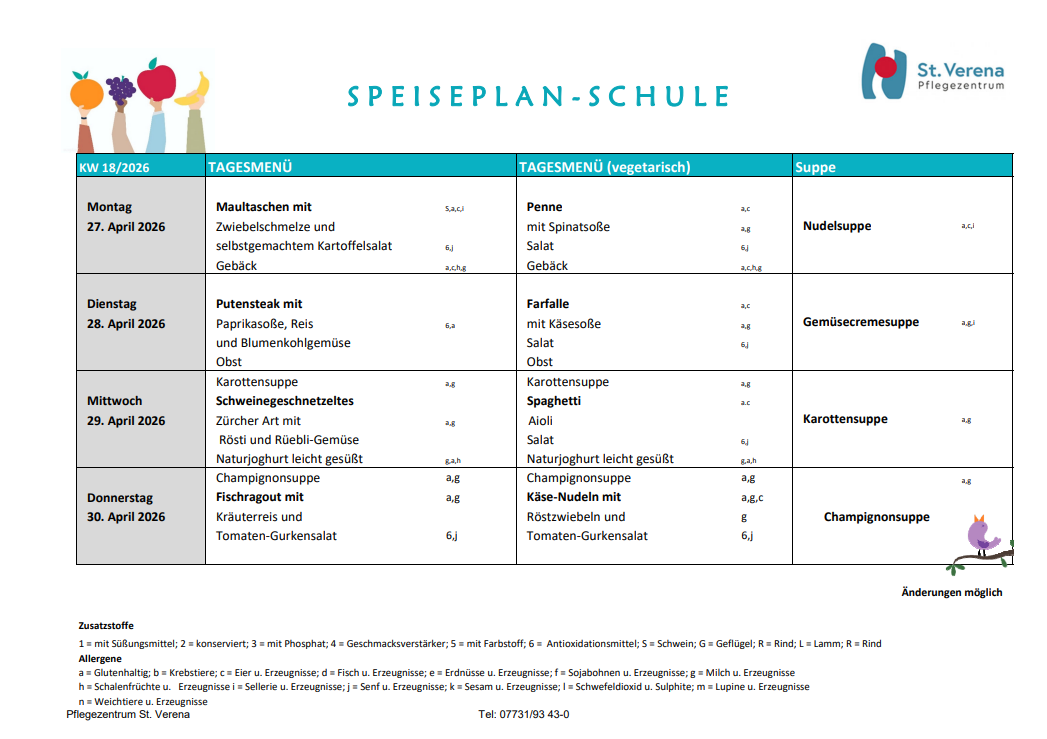 - Zu allen Fragen rund um das Speiseangebot wenden Sie sich an das Pflegezentrum St. Verena, Telefon: 07731/93 43-0